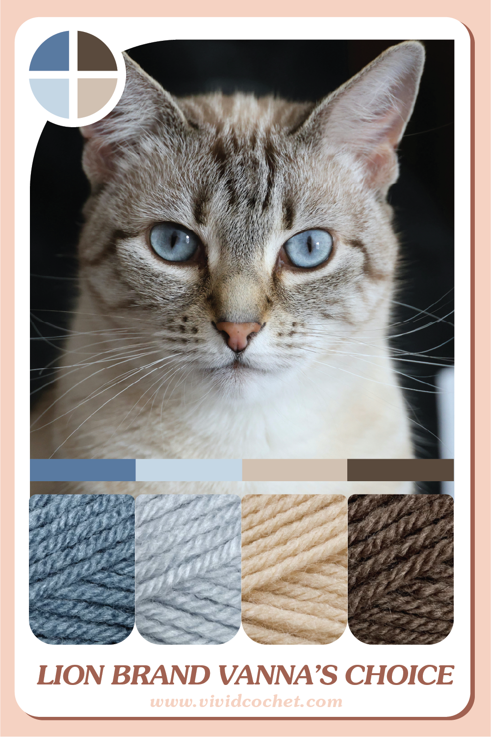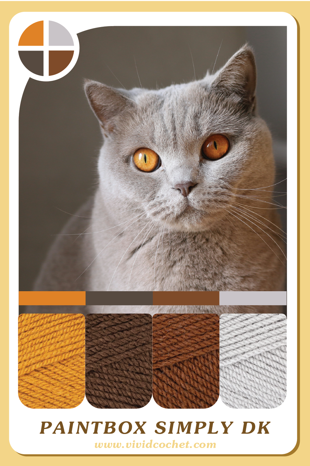 Cats also only have a limited amount of color range in their eyes. So this is also a reminder that you can limit your colors and still have a lot of options. So to represent the cool colors, we have blue eyed & green eyed cats, and Golden, or Amber colored cat eyes for the warm tones. I decided to switch things up and only do 1 brand of yarn per palette, and expanded the collection to 8 palettes. Please let me know if you like it more the other way.