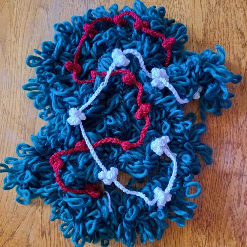 In any Finger Knitting green yarn, I used Evergreen Loops Yarn at the time of pictures. Unfortunately, I am not able to find this specific brand now, however I’ve found some alternatives. Any yarn used for finger knitting in green should work. Such as Loop Yarn Finger Yarn (Christmas)